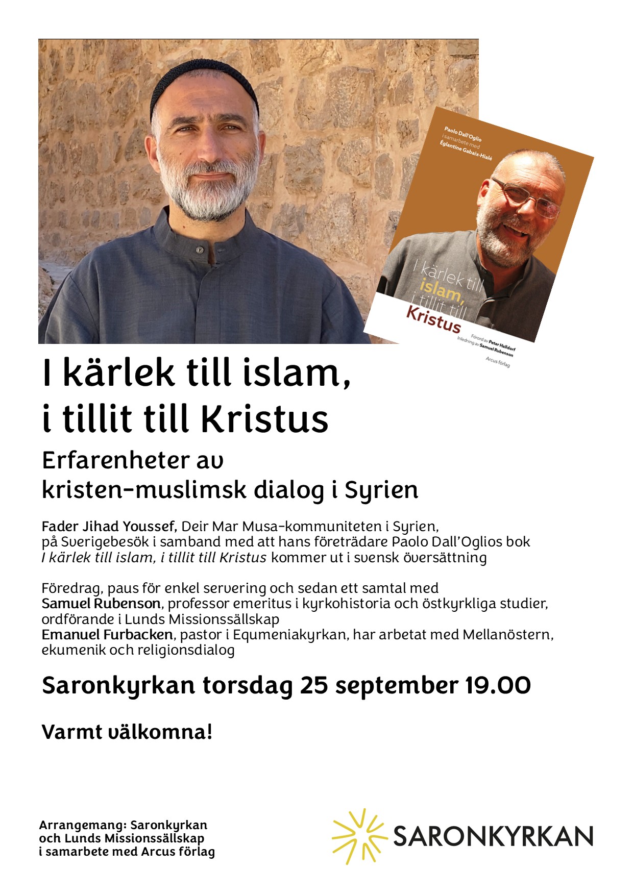 Sensus presentation: Fader Jihad Youssef, ledare för Deir Mar Musa-kommuniteten i Syrien och efterträdare till Paolo Dall’Oglio, gästar Sverige i samband med att Dall’Oglios bok I kärlek till islam, i tillit till Kristus nu ges ut i svensk översättning. Under samtalet möter han Samuel Rubenson, professor emeritus i kyrkohistoria och östkyrkliga studier samt ordförande för Lunds Missionssällskap, för en dialog om bokens budskap och dess betydelse.