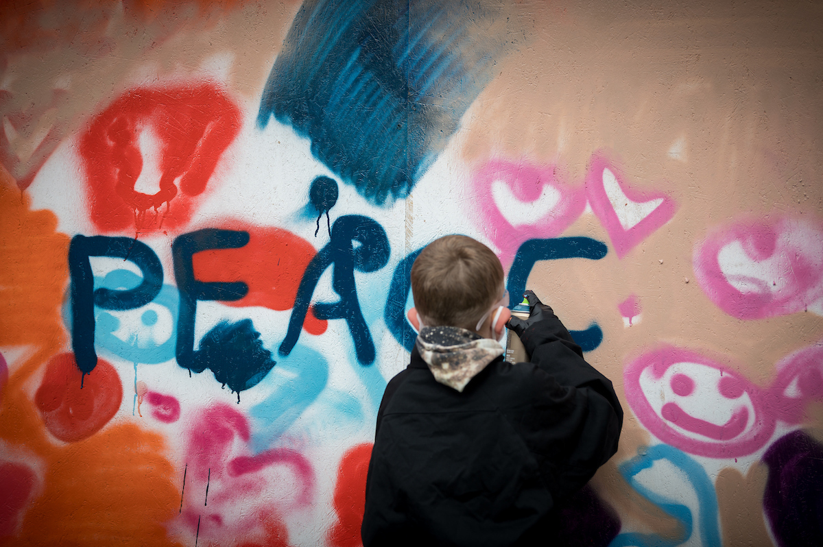I Kungsträdgården har några barn hörsammat inbjudan att vara med och måla fredsbudskap på en vägg. ”Heart Stockholm” kallas helgprogrammet som samlar gäster från kyrkor i flera världsdelar, ekumenikvänner från hela Sverige och Stockholmsbor som råkar vara ute.